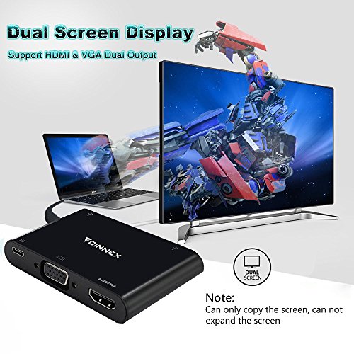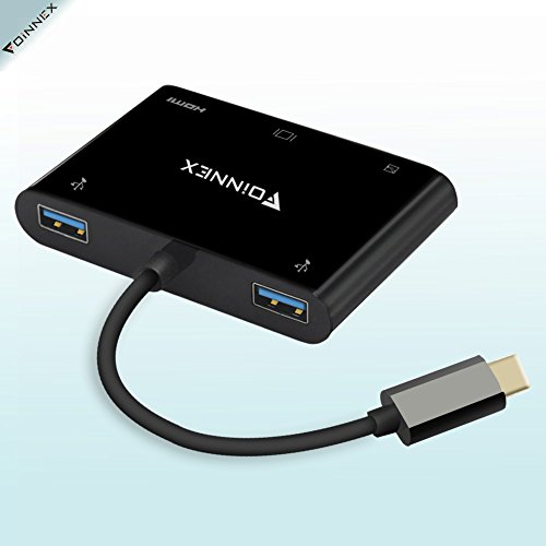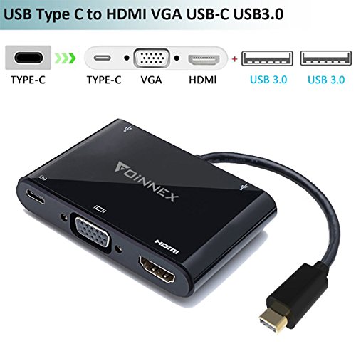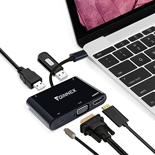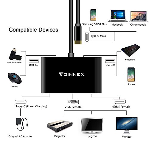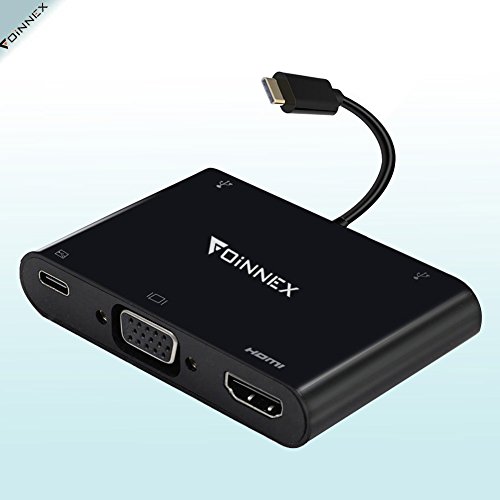 FOINNEX USB C to HDMI, VGA, USB 3.0 (5-IN-1) Multiport HUB adapter dock with USB charging C Connect your laptop (2016,2017 Macbook pro etc.) Or smartphone (Galaxy S8 / S8 plus etc.) to the HDMI and VGA display, while connecting 2 USB devices (OTG support) and with the USB power distribution function -C (PD).